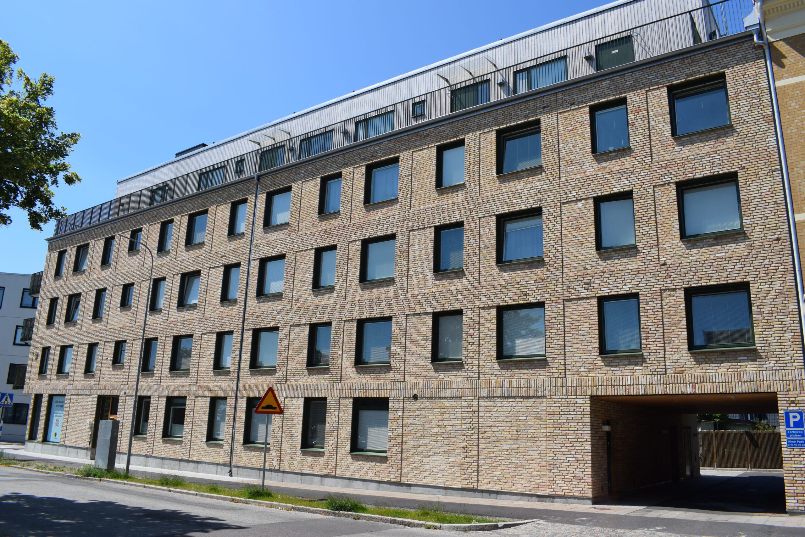 Byggnaden består av återbrukat tegel i gulmix samt träfasad, med gröna fönster och dörrar samt svart papptak med solceller. Fina detaljer i teglet gör att fasaden sticker ut.