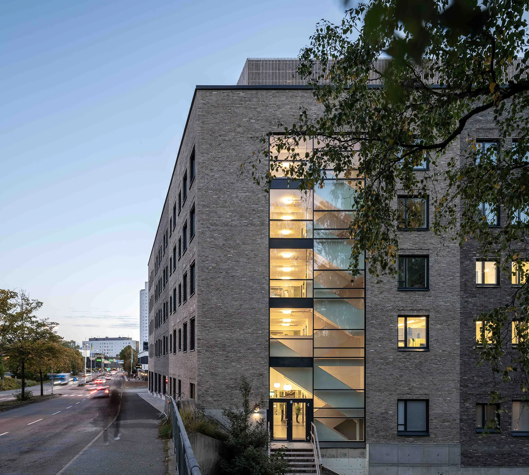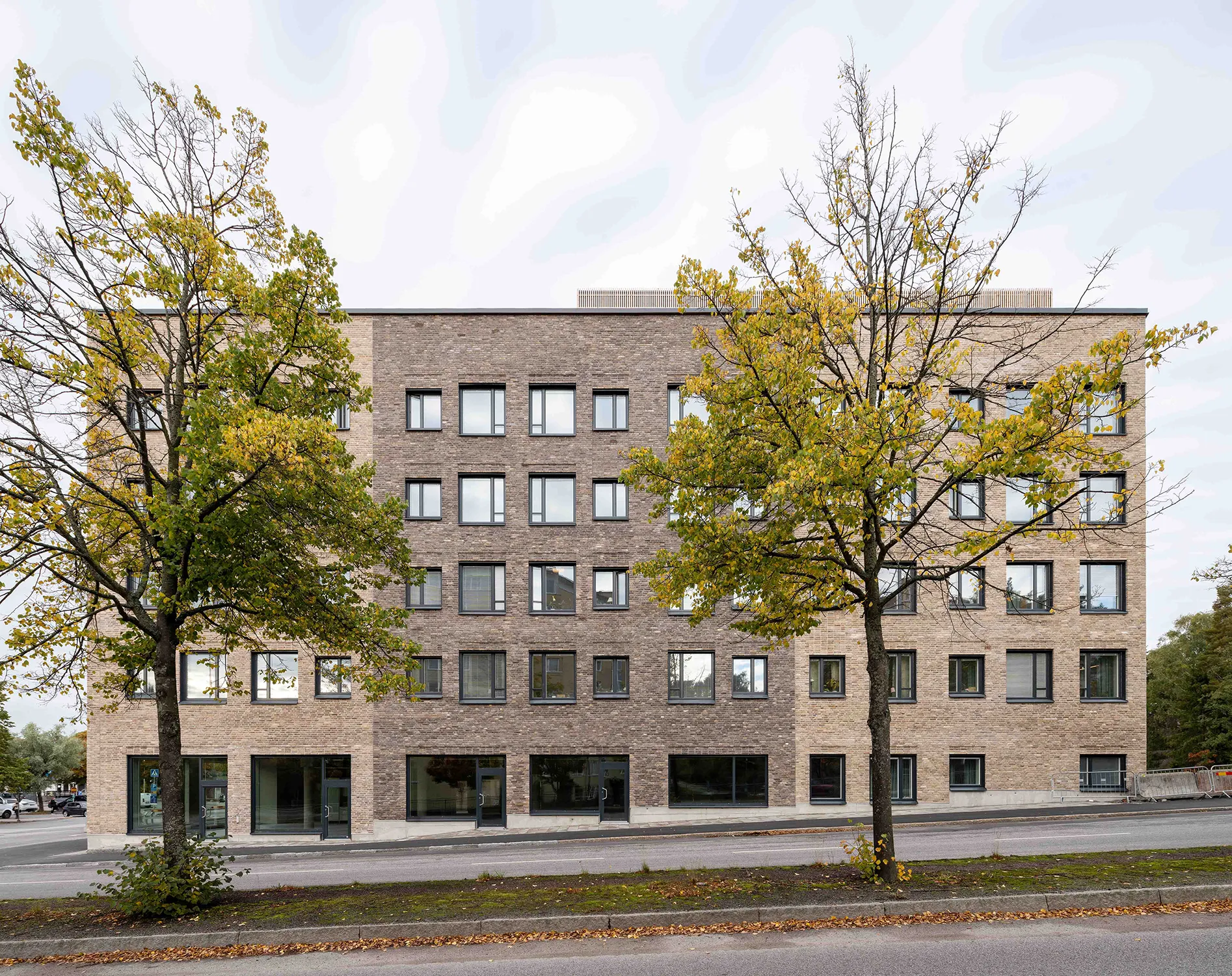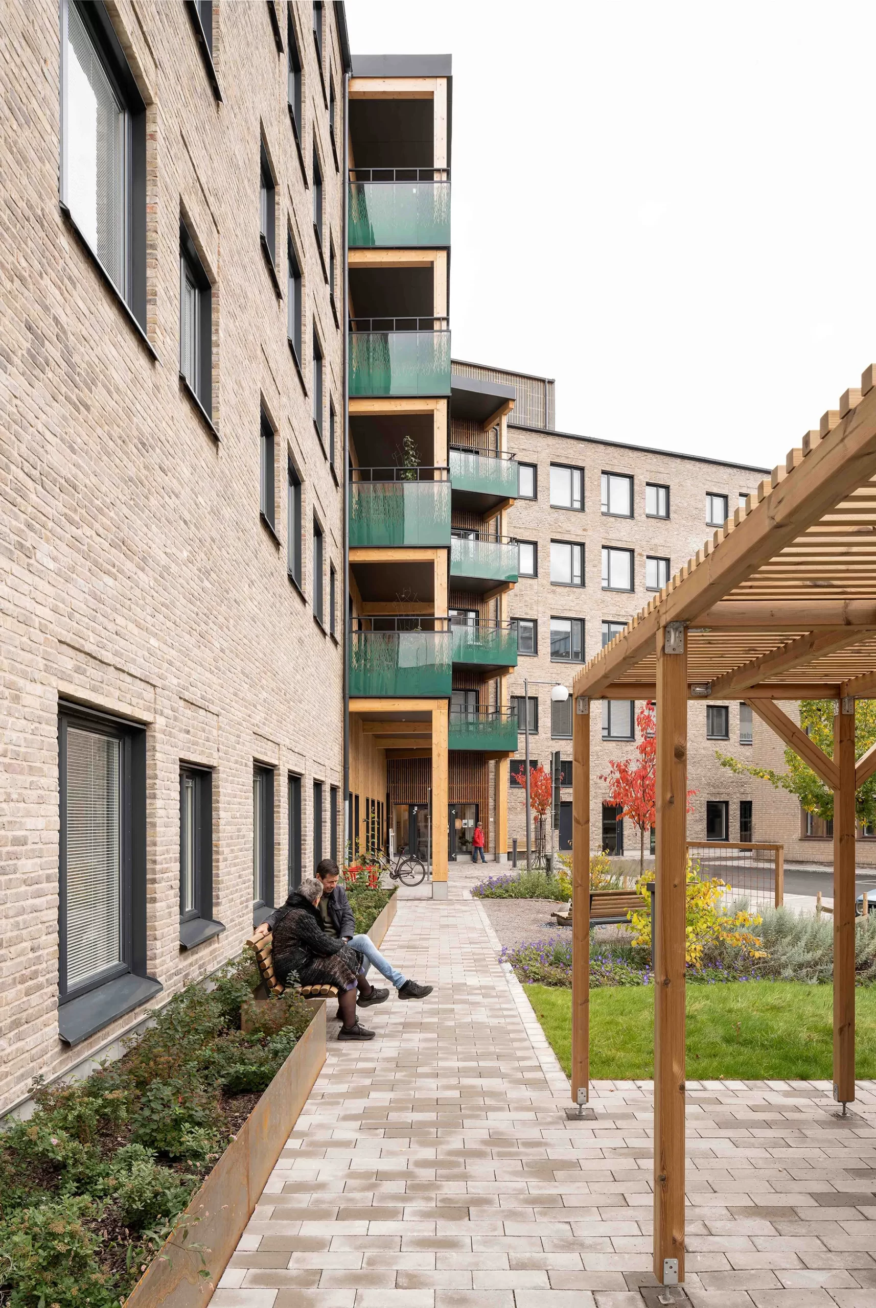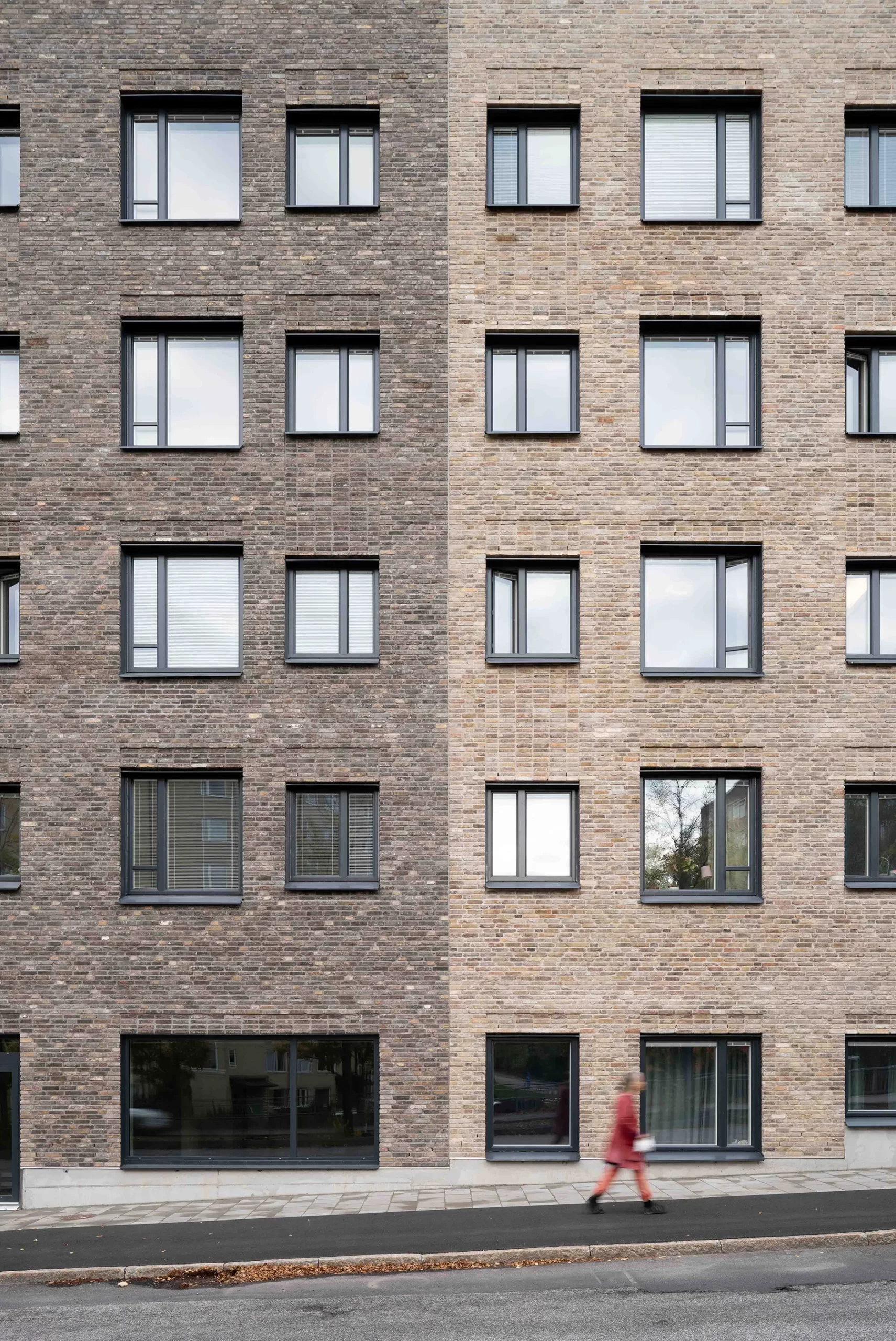 Fasaderna har murats med återbrukat tegel i två olika nyanser.
