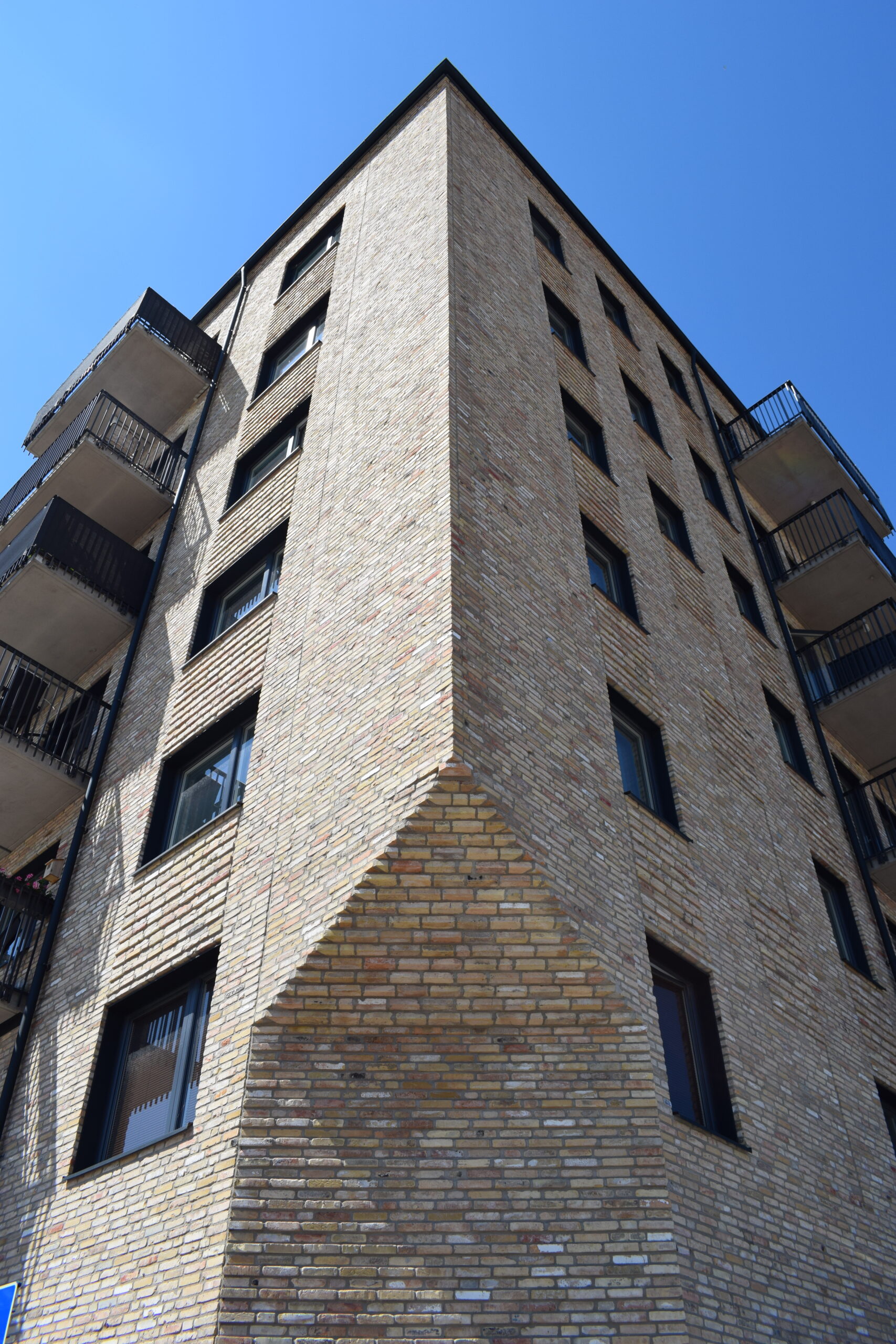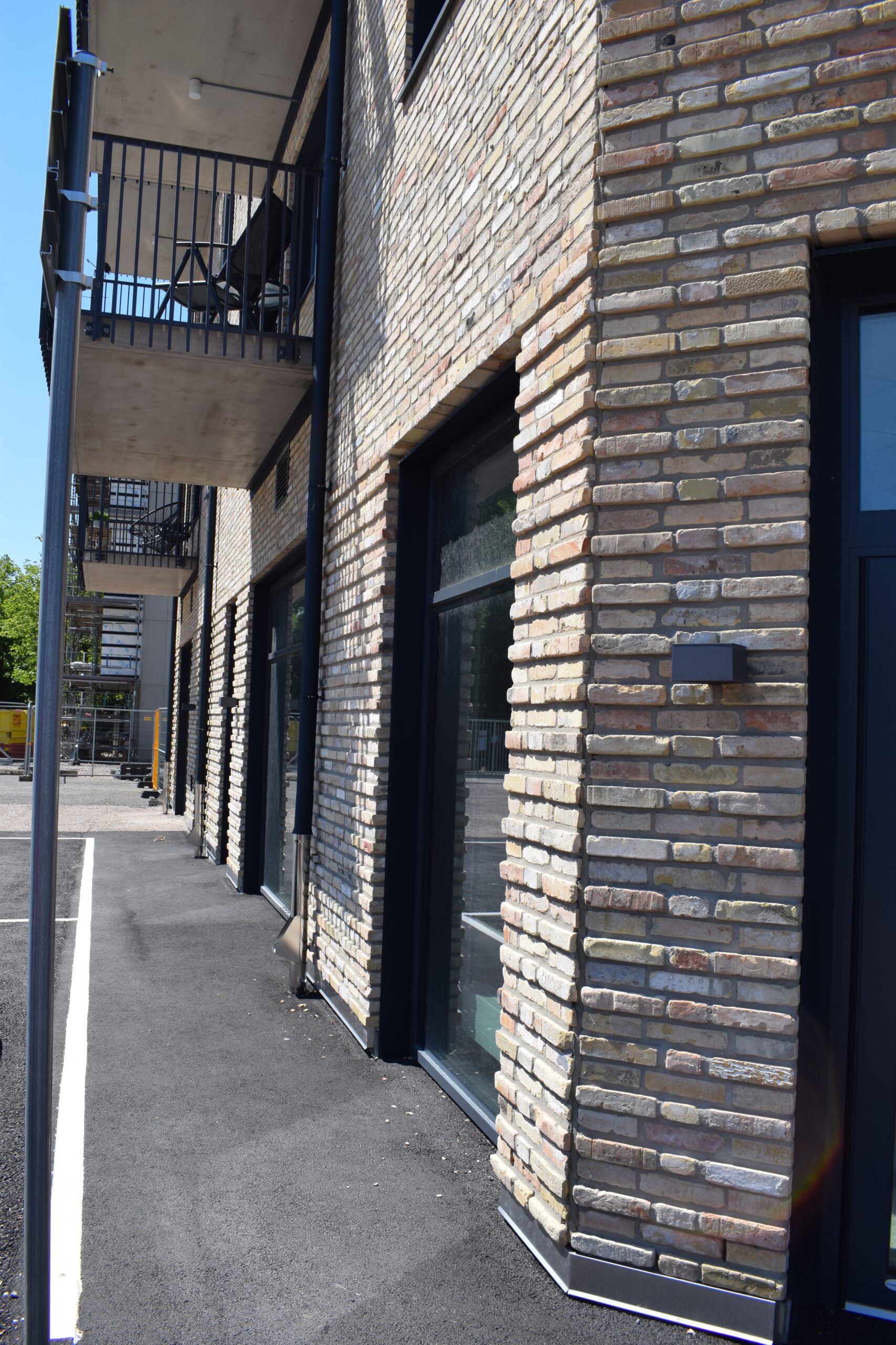 Ett exempel är det återbrukade teglet som används som fasad ut mot gatan. Materialet är både vackert och klimatvänligt, en perfekt kombination!