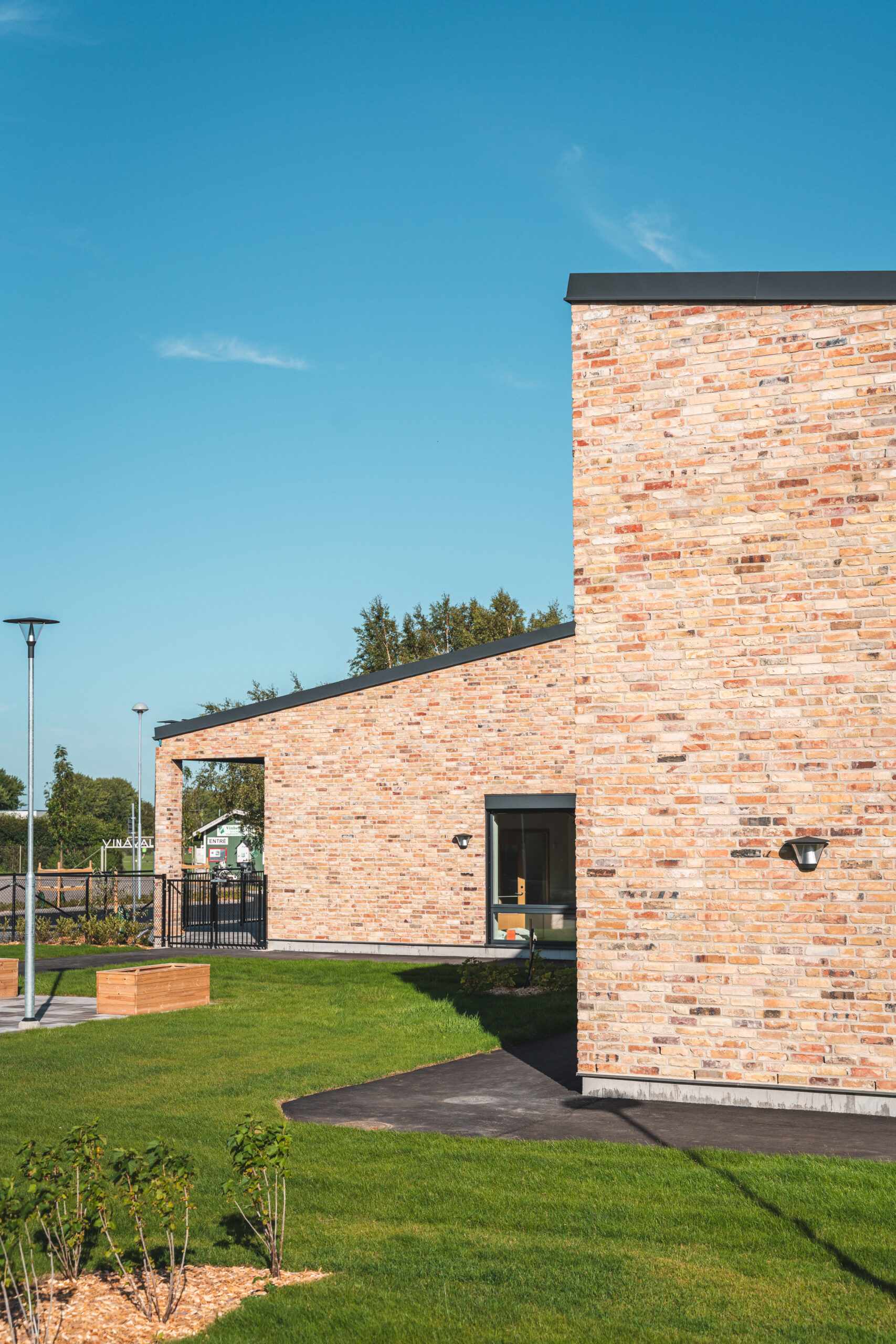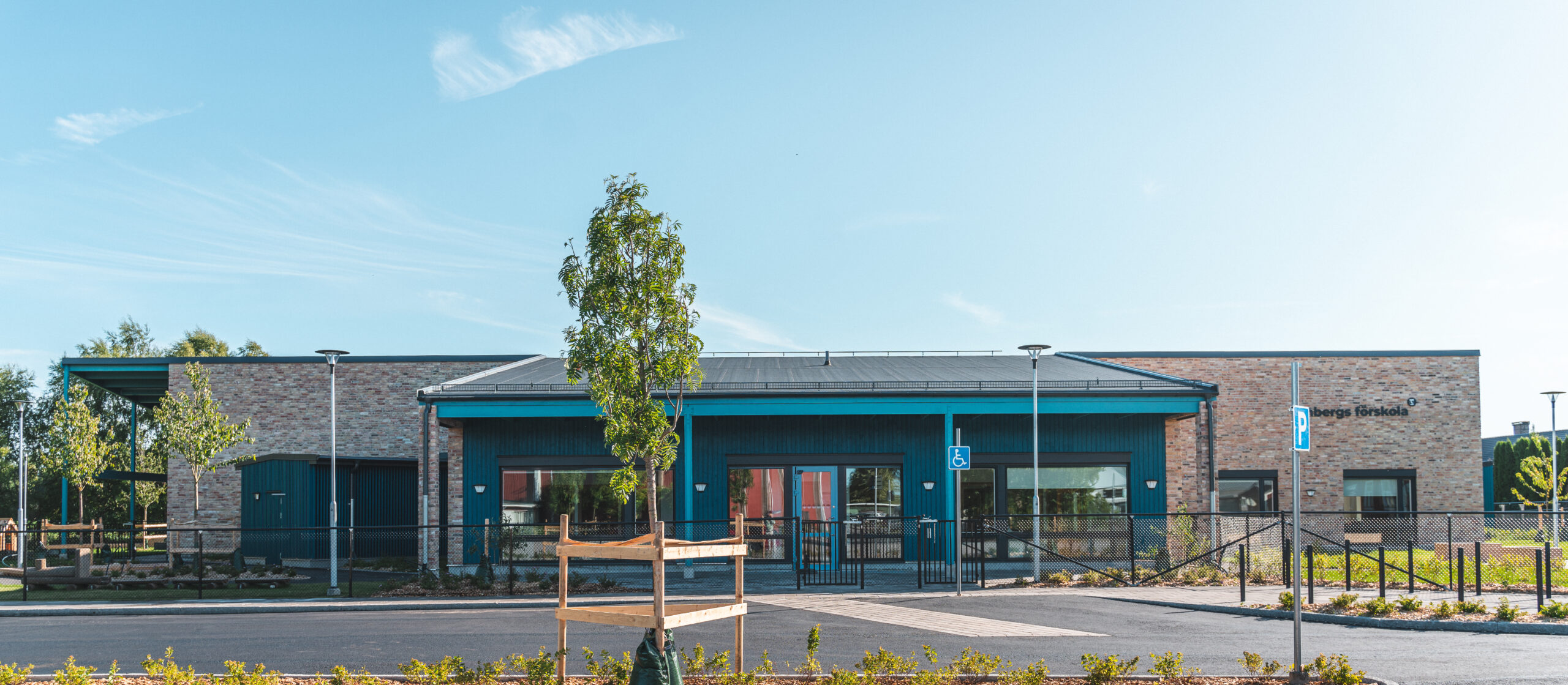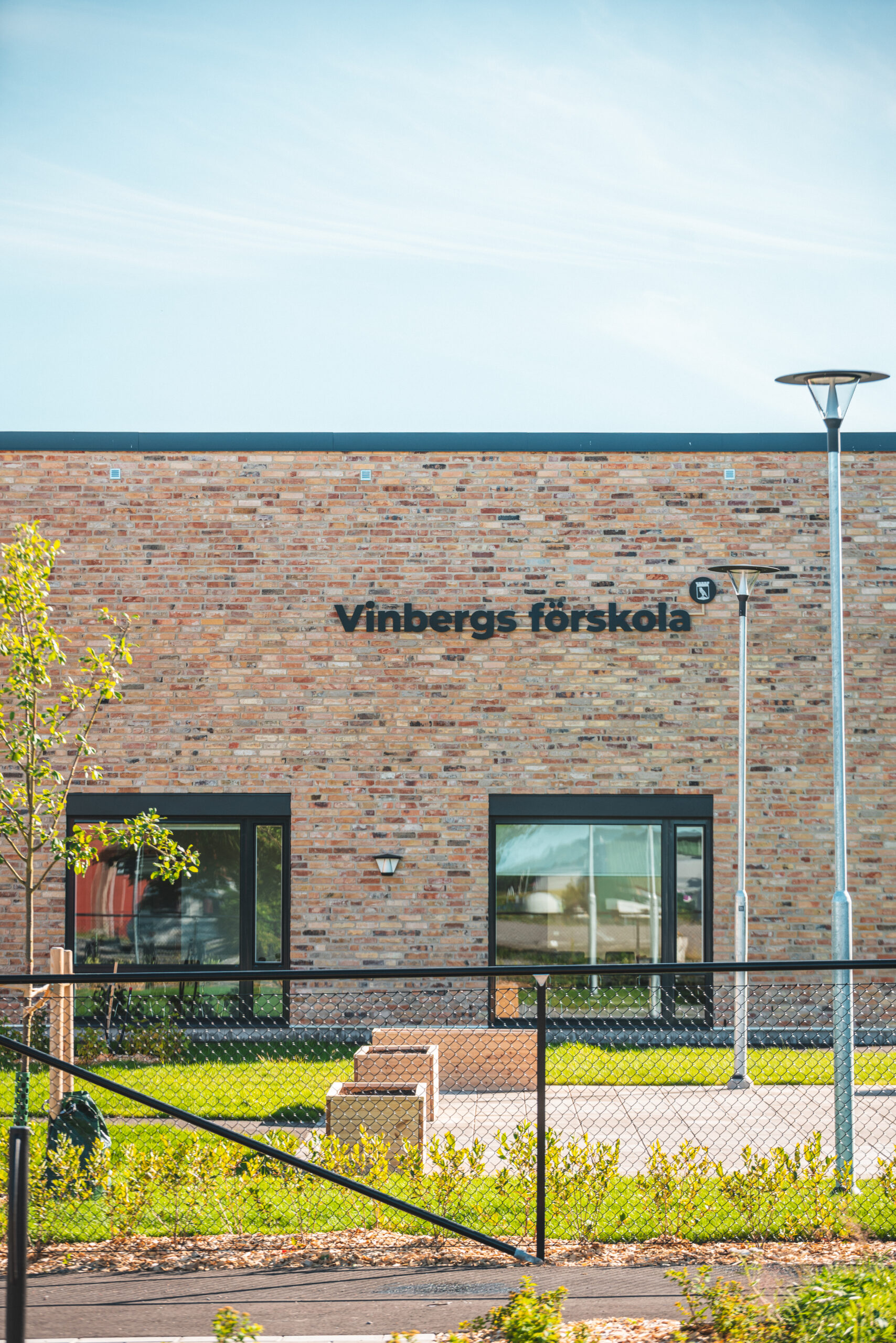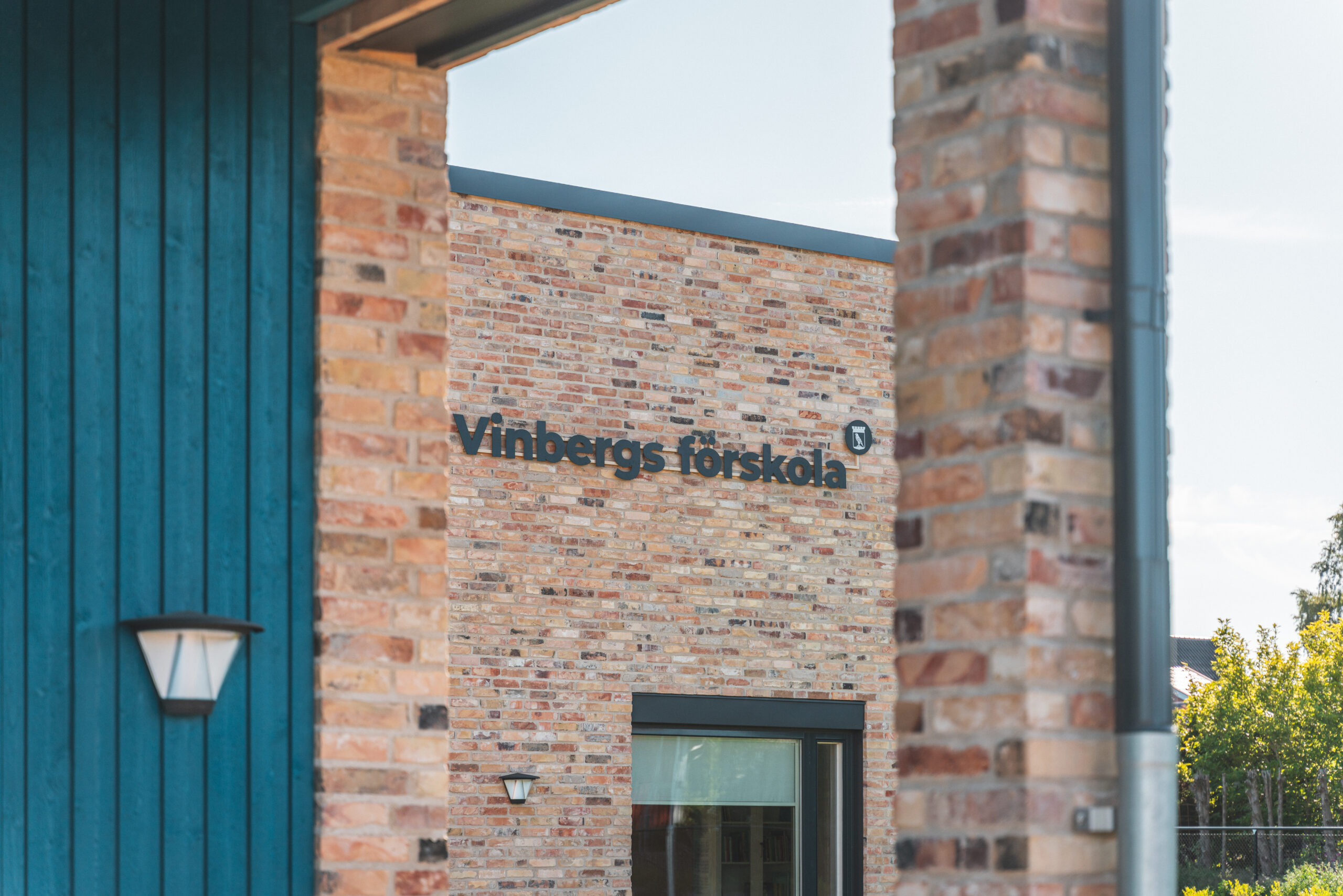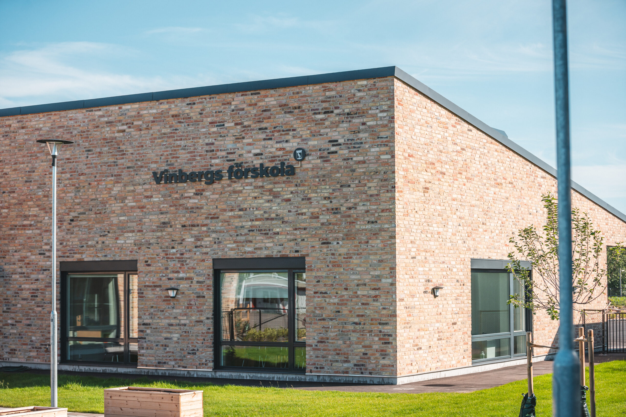 Vinbergs förskola, belägen några km utanför Falkenberg, har precis öppnat upp sin verksamhet. Första spadtaget togs 30 april 2024 och i september 2025 var det invigning. Här har det byggts 4 avdelningar med plats för 60 barn sammanlagt. Utvändigt har det använts cirka 18000 återbrukade gula tegelstenar.